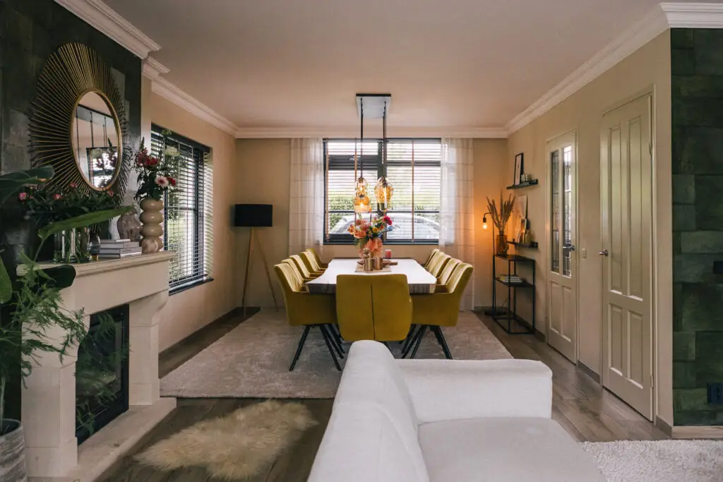 Een belangrijke wens was om met veel mensen samen aan één tafel te kunnen zitten, zonder telkens met stoelen te moeten schuiven. Daarom kozen we voor een royale boomstamtafel: stoer, praktisch en gemakkelijk in onderhoud. Het behang van Elitis is een tikkeltje gewaagd, maar dankzij de warme kleur en diepe structuur brengt het juist een intieme sfeer.